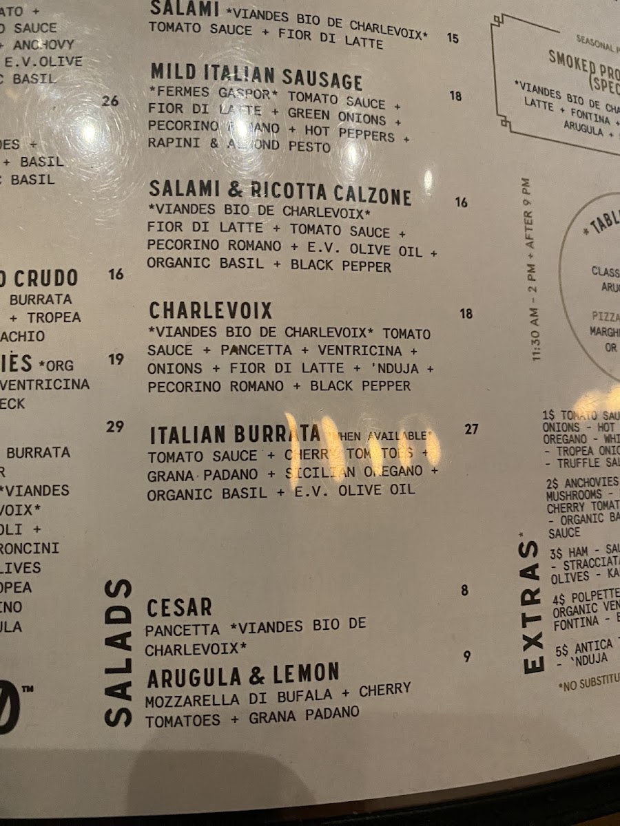 *VIANDES BIO DE CHARLEVOIX* FIOR DI LATTE + SAUCE TOMATE + PECORINO ROMANO + HUILE D’OLIVE E.V. + BASILIC + POIVRE NOIR / *ORGANIC MEATS FROM CHARLEVOIX* FIOR DI LATTE + TOMATO SAUCE + PECORINO ROMANO + OLIVE OIL E.V. + BASIL + BLACK PEPPER